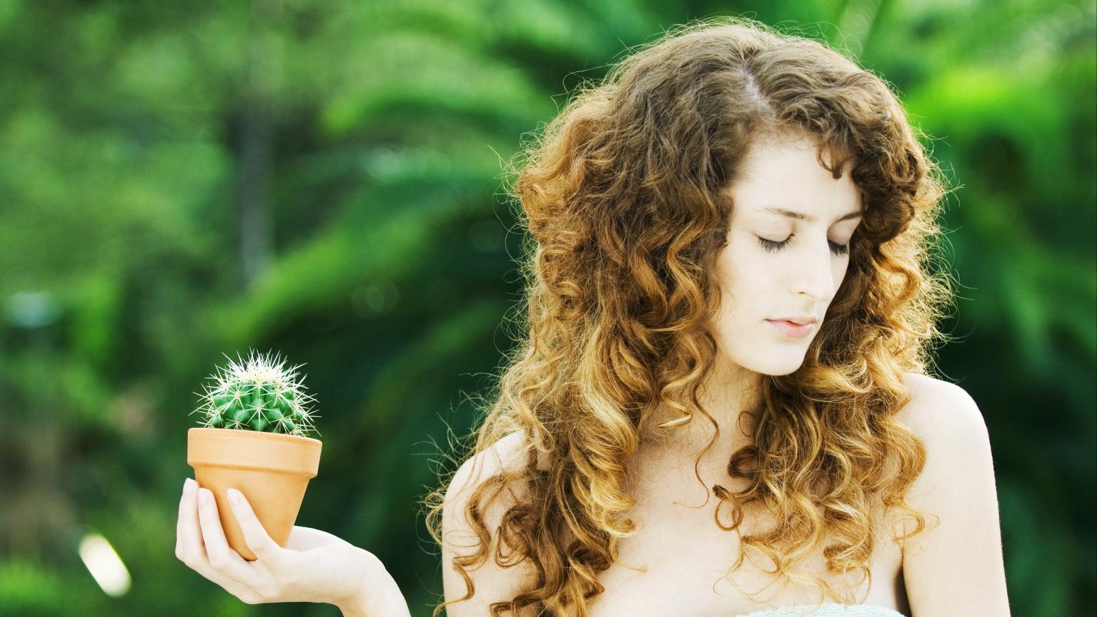 Wallpaper Beautiful girl with closed eyes with a cactus in hand