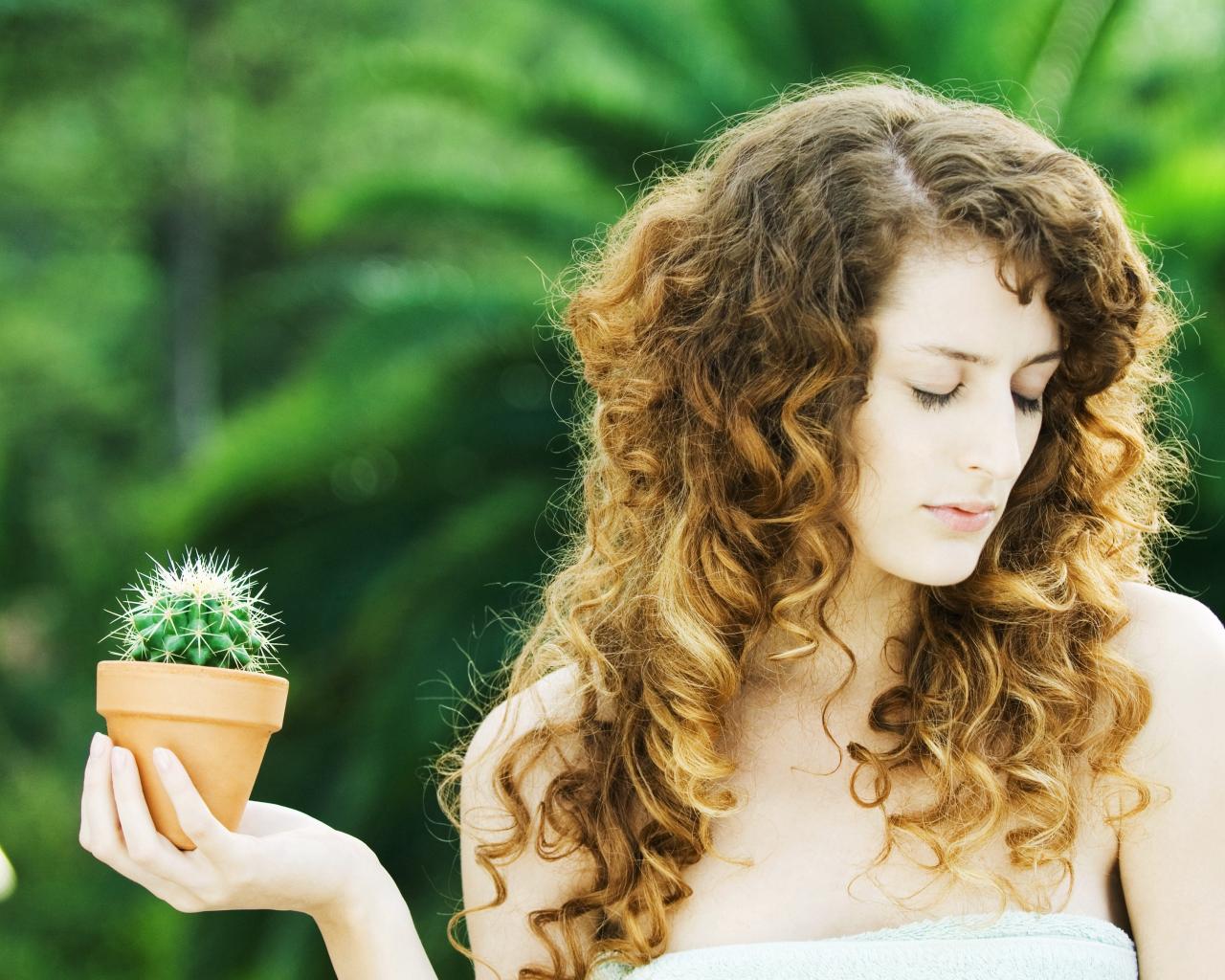 Wallpaper Beautiful girl with closed eyes with a cactus in hand