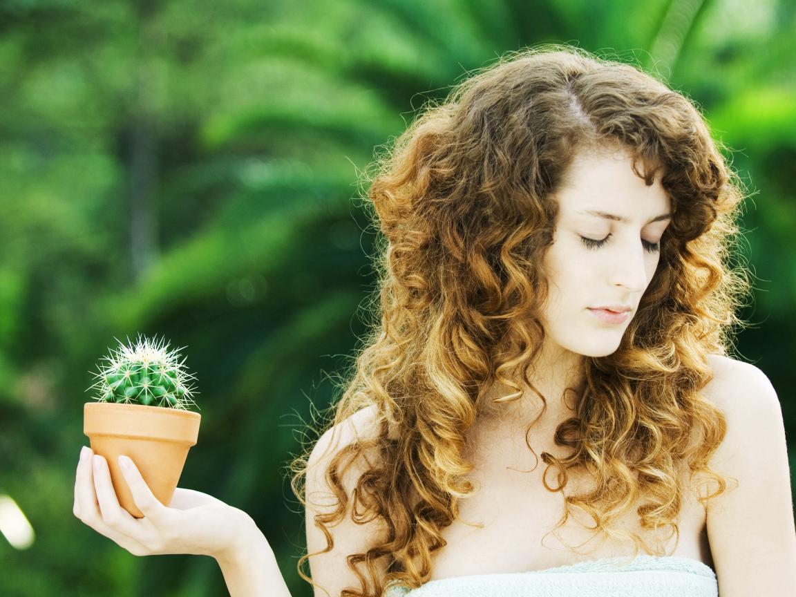 Wallpaper Beautiful girl with closed eyes with a cactus in hand