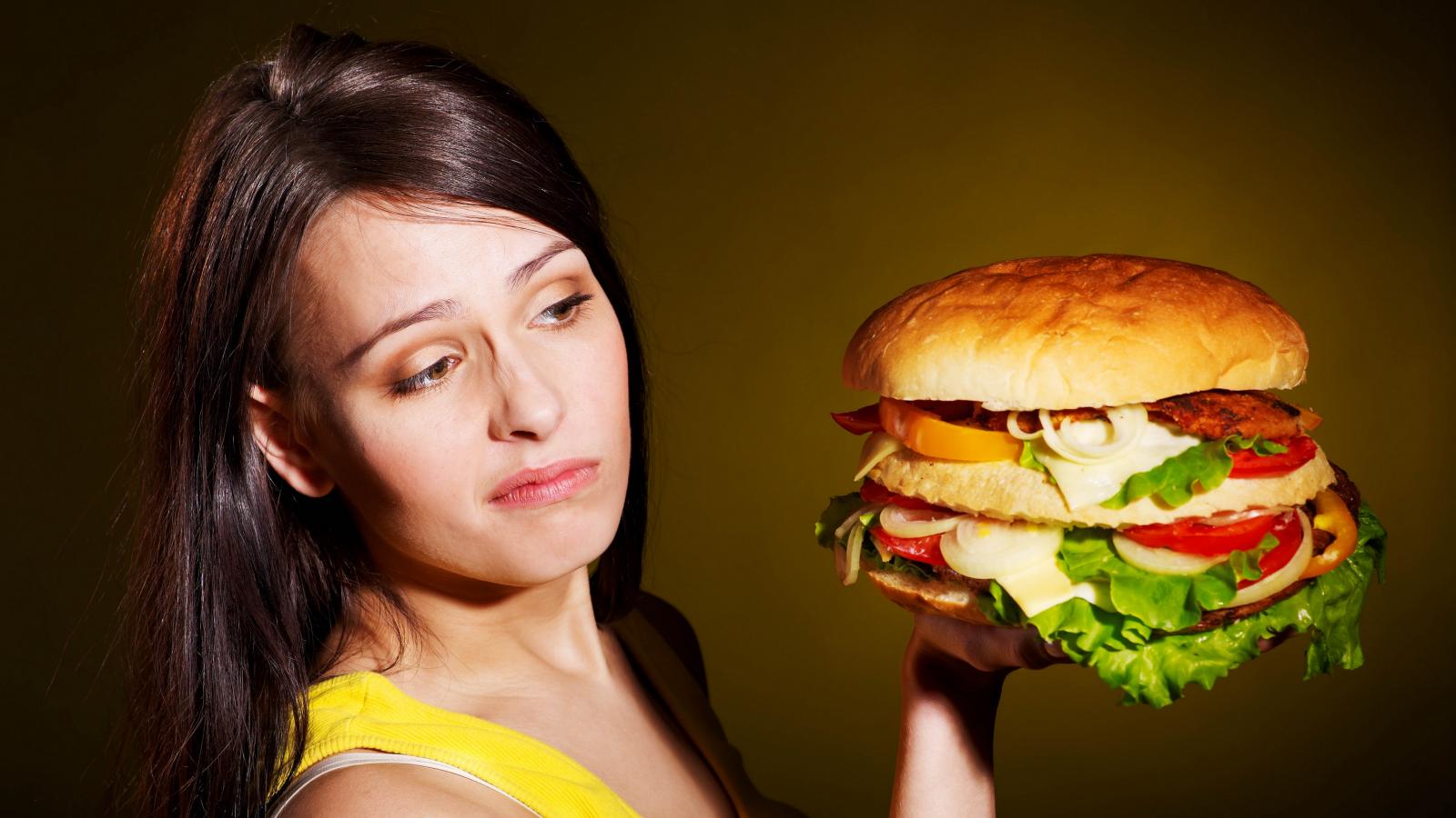 Wallpaper Dissatisfied girl with a big hamburger in her hands