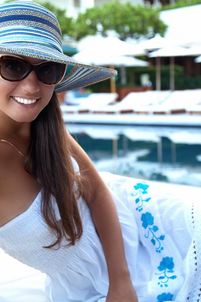 Wallpaper Smiling girl in sunglasses and a hat by the pool