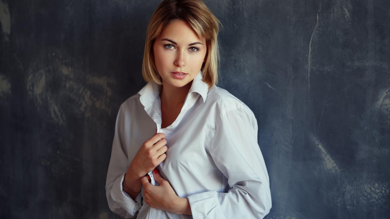 Wallpaper Beautiful blonde girl in a white shirt near the wall