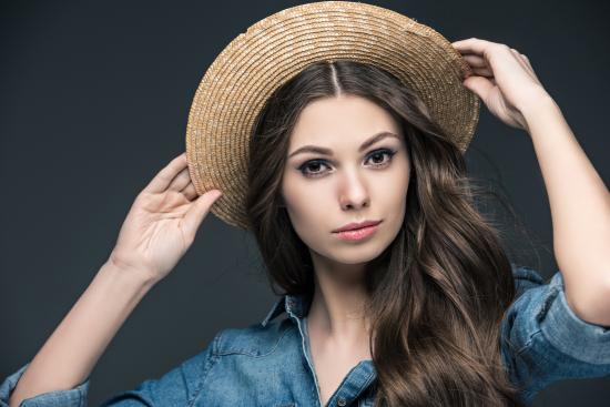 Wallpaper Beautiful girl in a straw hat on a gray background