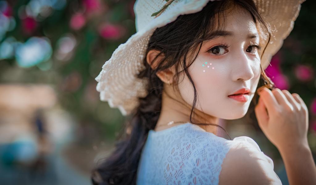 Wallpaper Young asian girl with hat