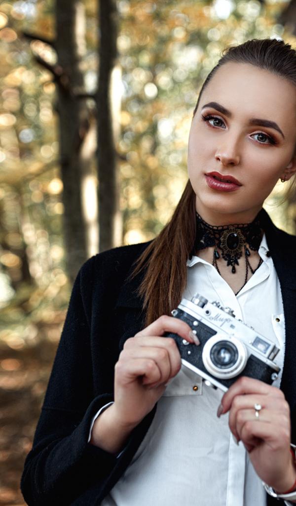 Wallpaper Beautiful girl with a camera in hand stands by a tree