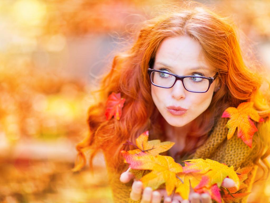 Wallpaper Red-haired girl in glasses holding fallen leaves
