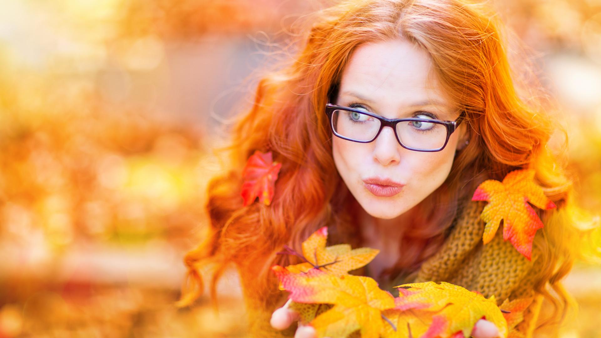 Wallpaper Red-haired girl in glasses holding fallen leaves