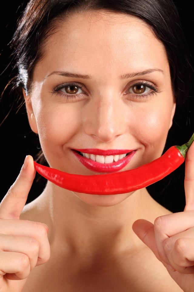 Wallpaper Smiling girl with red pepper on a black background