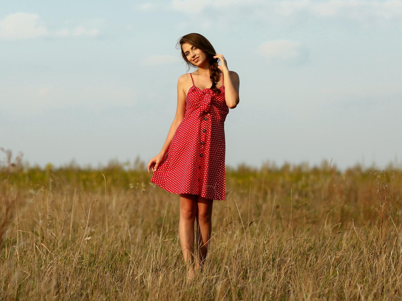 Wallpaper Beautiful girl in a red sundress on the field