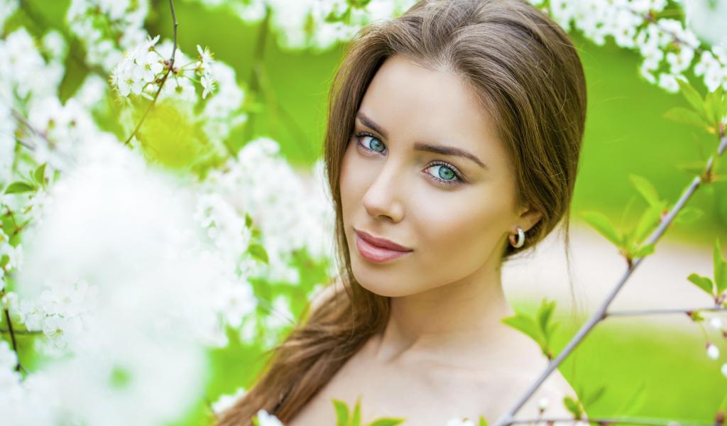 Wallpaper Beautiful green-eyed girl in cherry blossoms