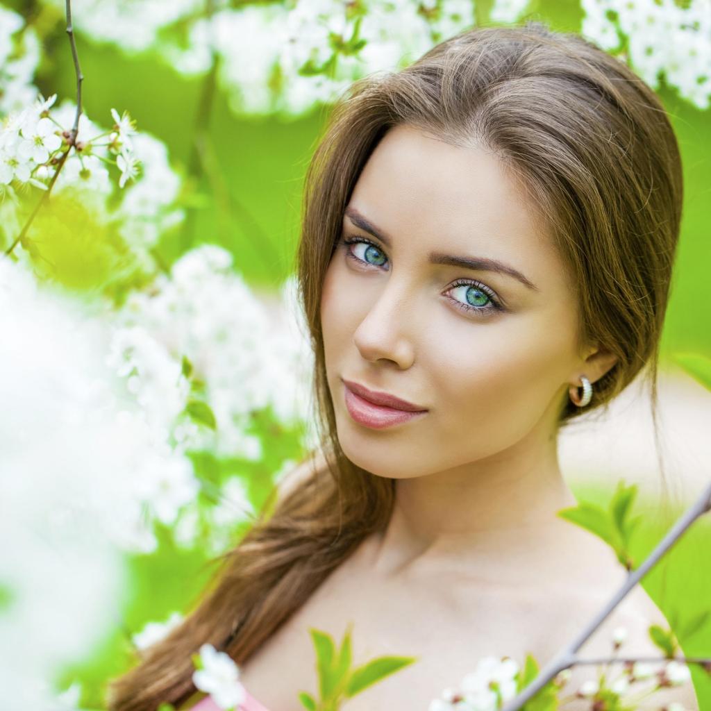 Wallpaper Beautiful green-eyed girl in cherry blossoms