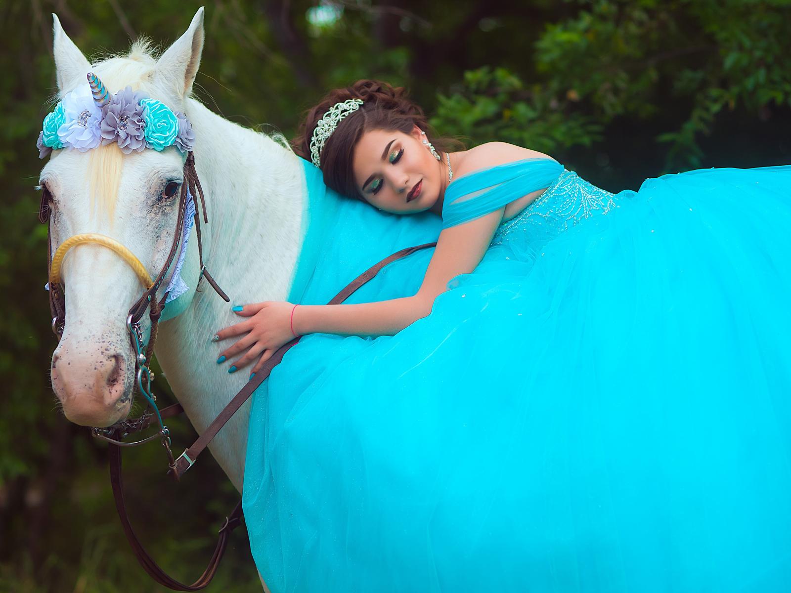 Wallpaper Beautiful girl in a magnificent blue dress on a horse