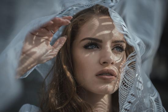Wallpaper Blue-eyed girl looks out the window with tulle