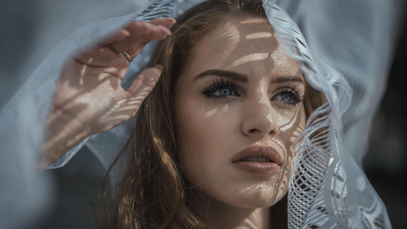 Wallpaper Blue-eyed girl looks out the window with tulle