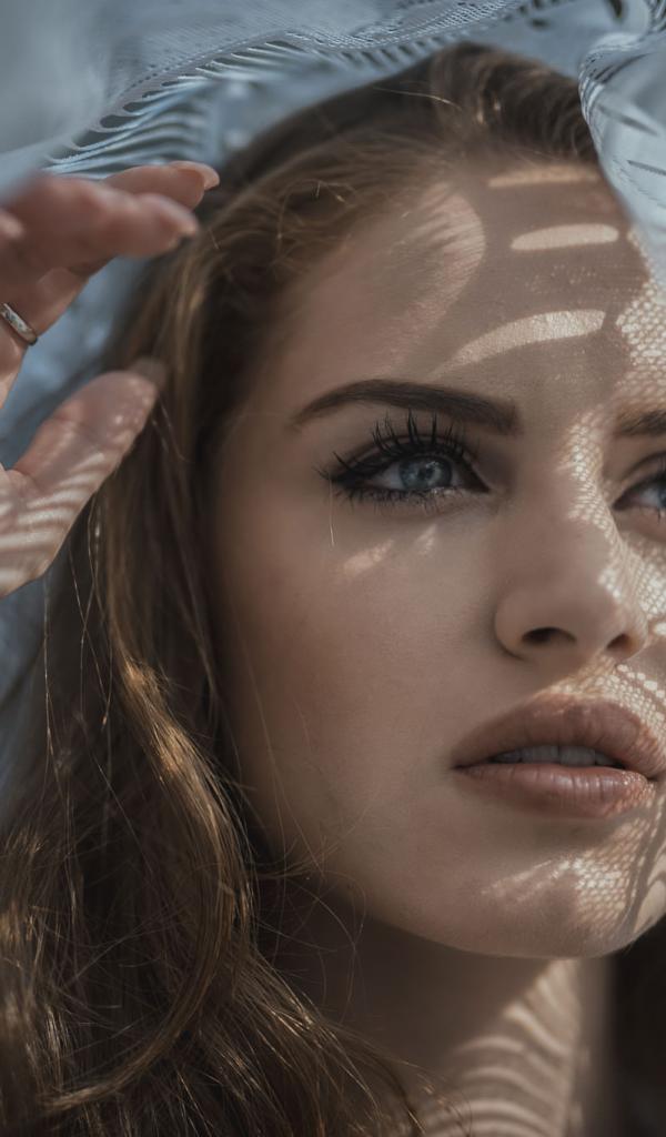 Wallpaper Blue-eyed girl looks out the window with tulle