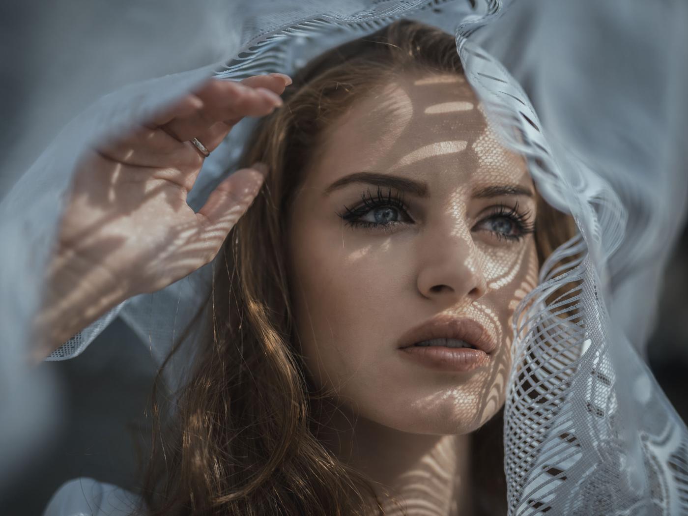 Wallpaper Blue-eyed girl looks out the window with tulle