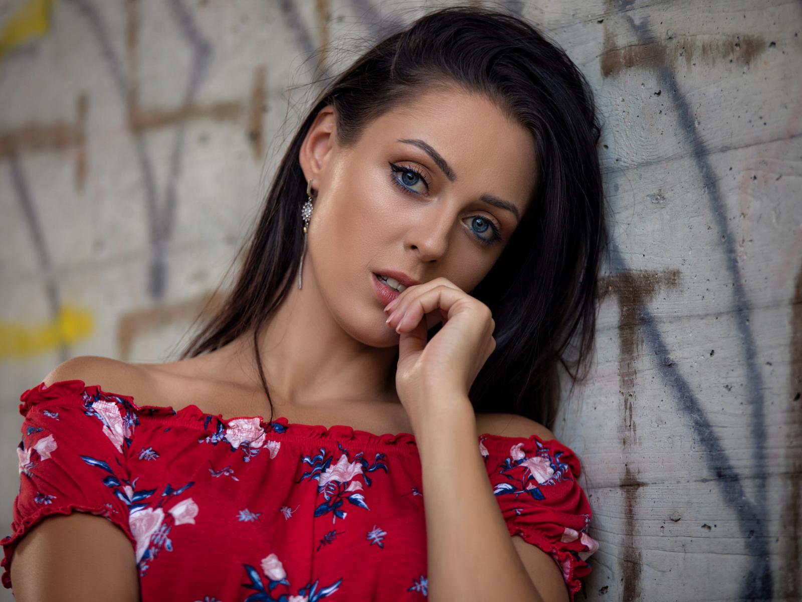 Wallpaper Blue-eyed brunette stands in a dress worth the wall