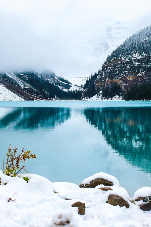 Wallpaper A girl stands on the blue lake on the snowy shore