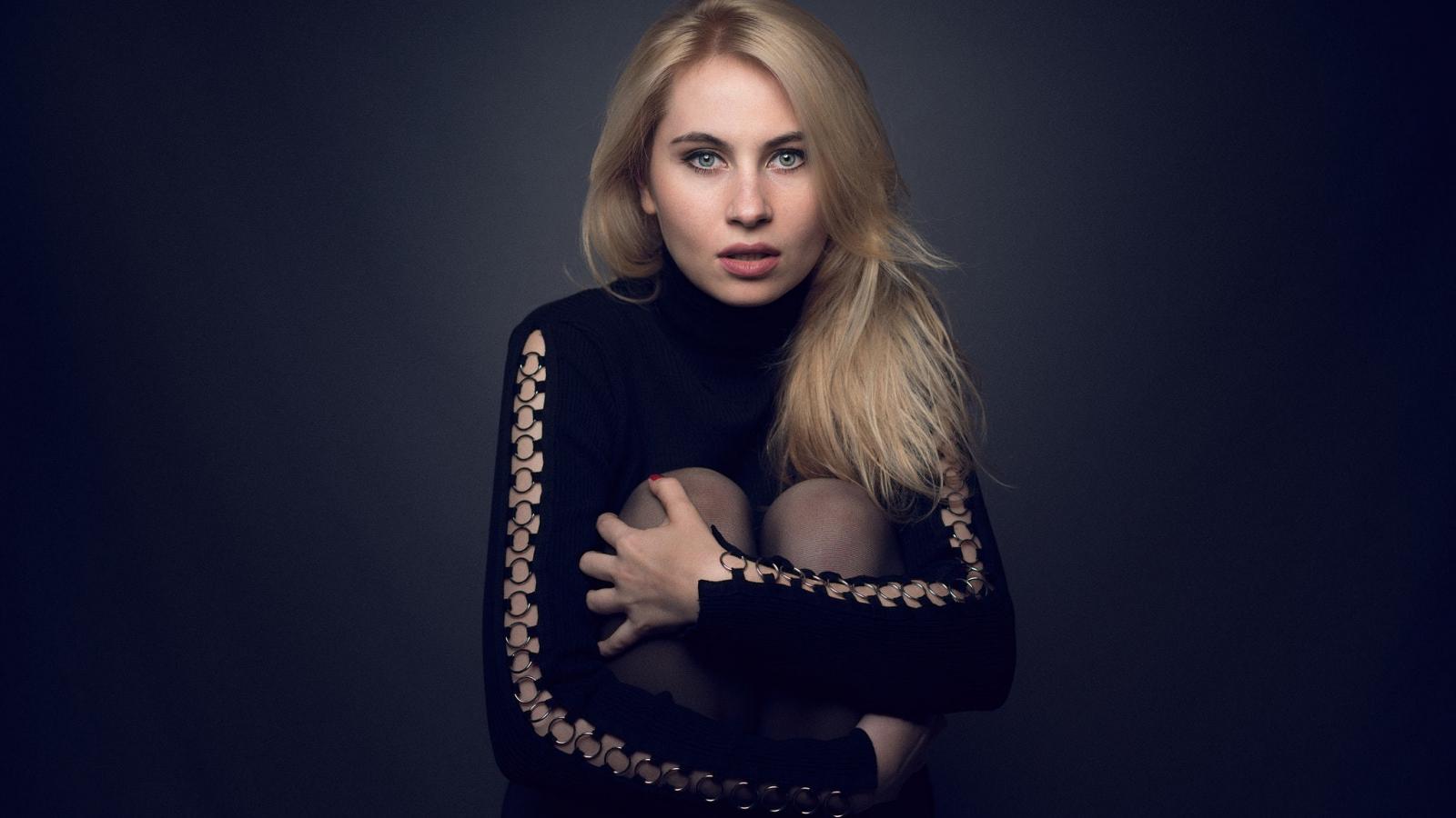 Wallpaper Blonde in a black dress on a gray background