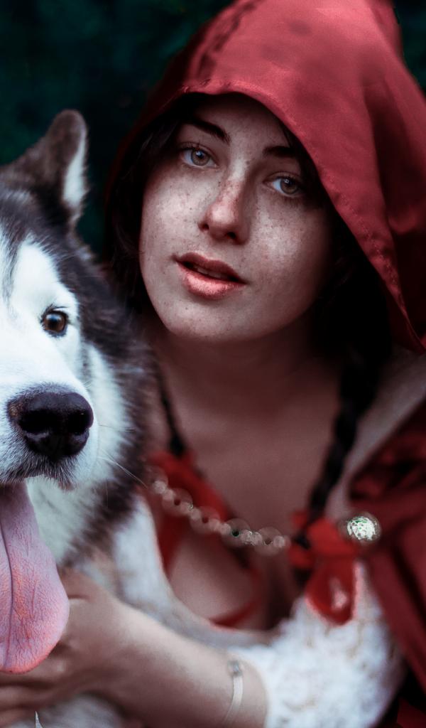 Wallpaper Girl in a red cloak with a dog breed Husky