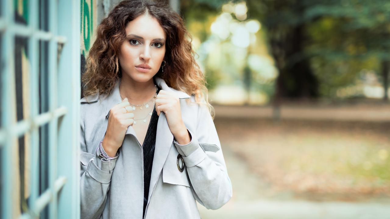 Wallpaper Beautiful girl in a gray cloak near the wall