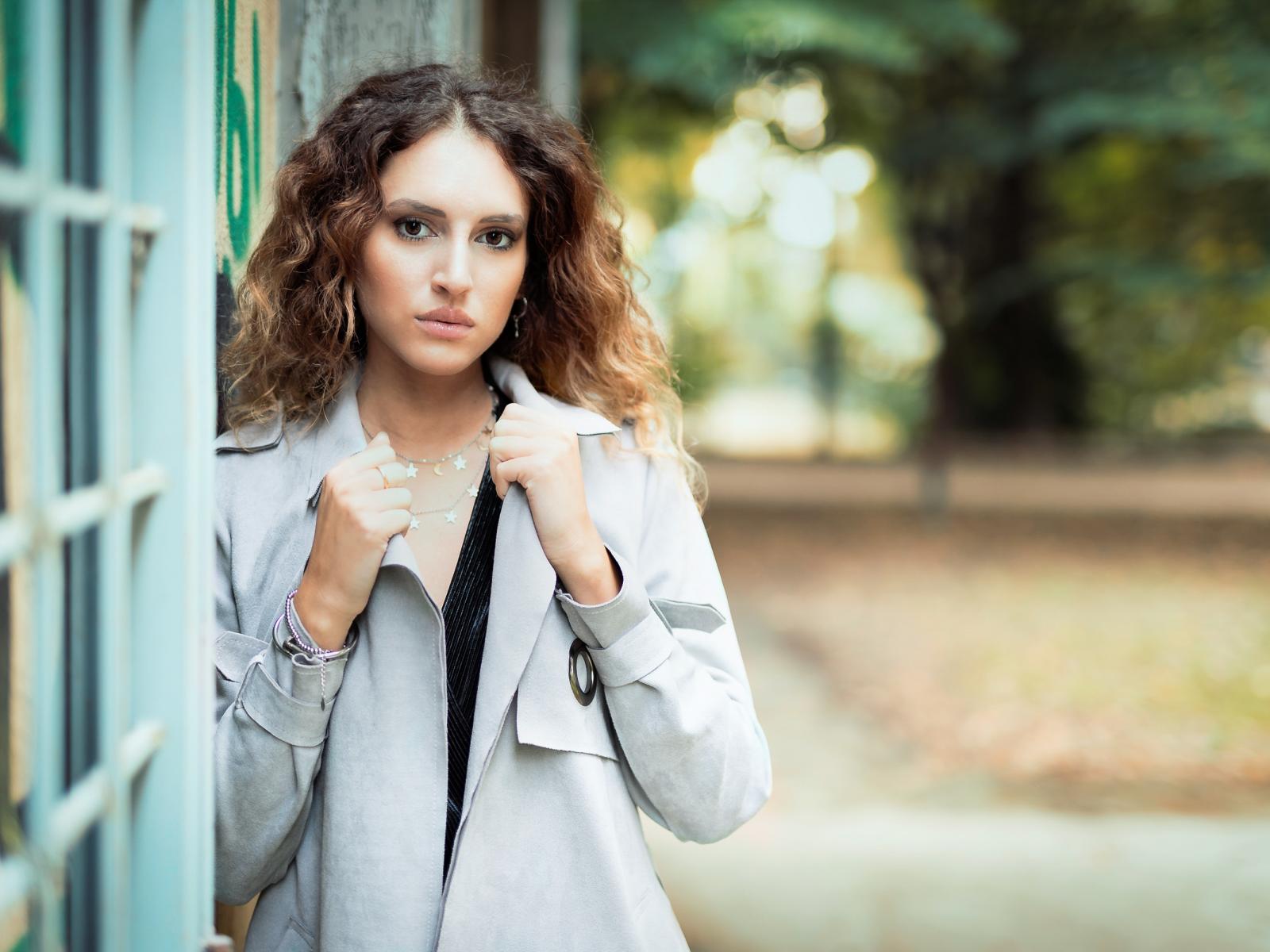 Wallpaper Beautiful girl in a gray cloak near the wall