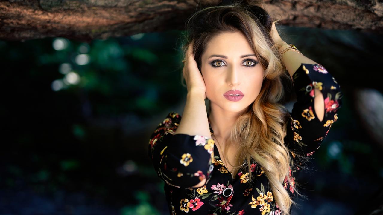 Wallpaper Beautiful girl with hands in the hair by the tree