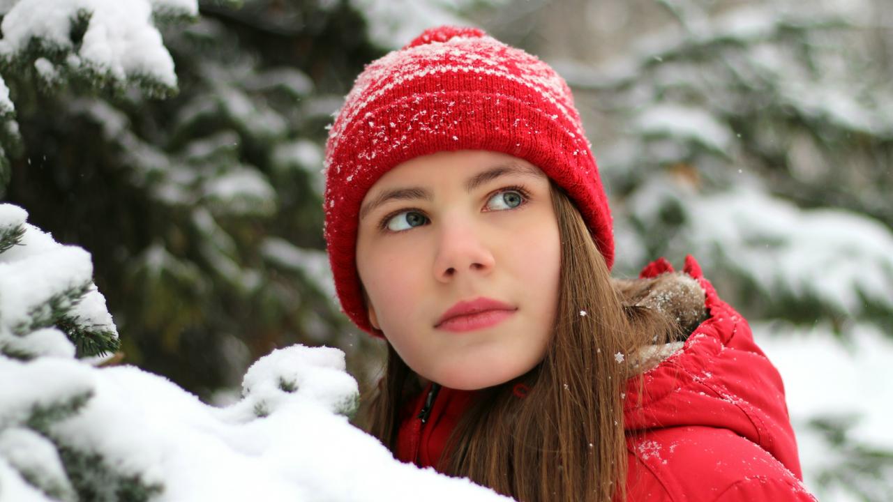 Wallpaper Beautiful young girl in a red cap by a snowy spruce