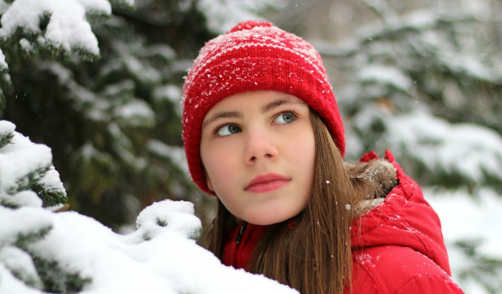 Wallpaper Beautiful young girl in a red cap by a snowy spruce