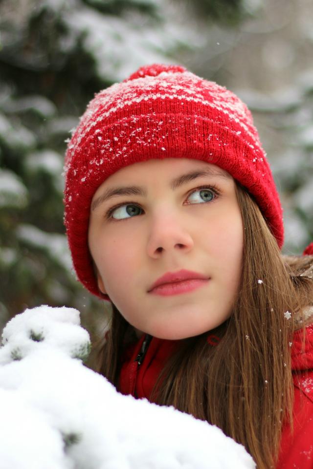 Wallpaper Beautiful young girl in a red cap by a snowy spruce