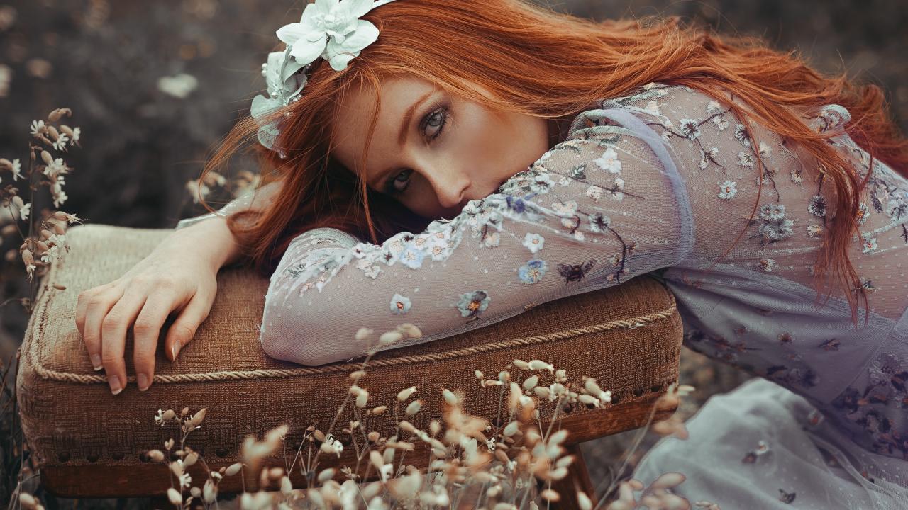 Wallpaper Beautiful red-haired girl lies on a chair
