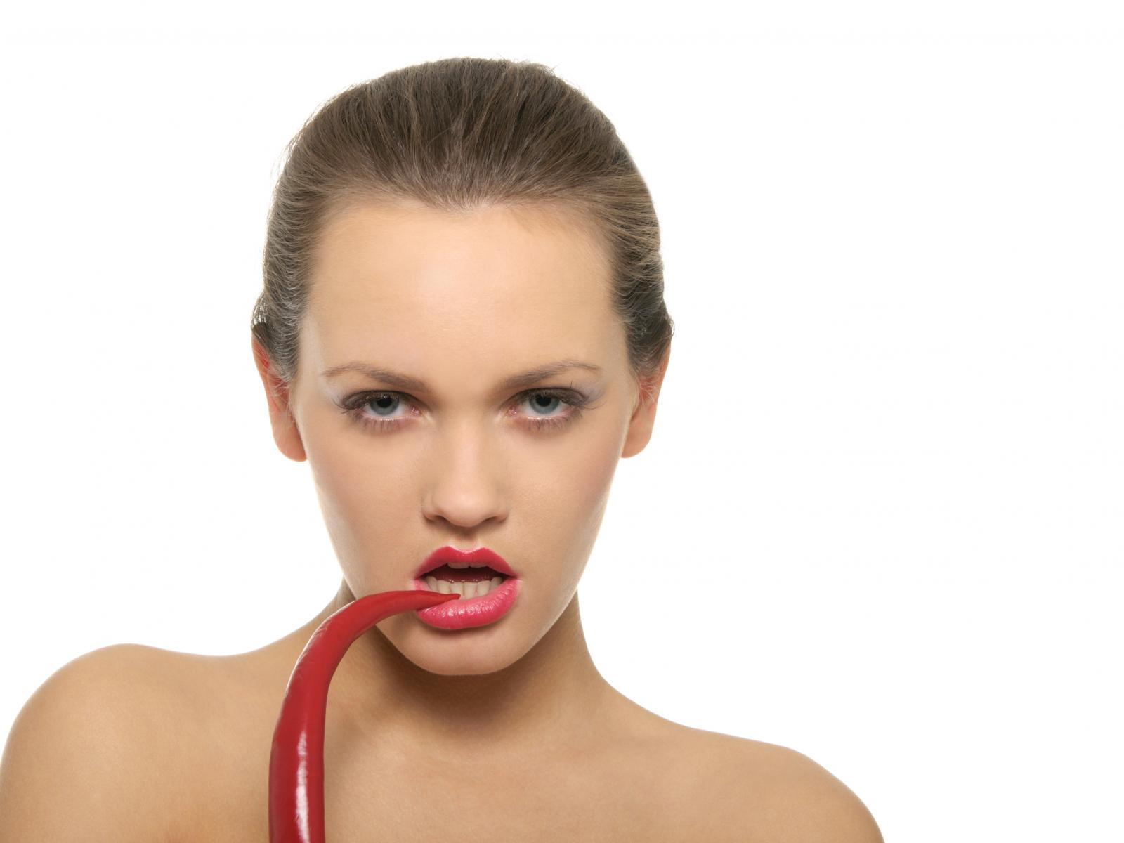 Wallpaper Young girl bites red pepper on a white background