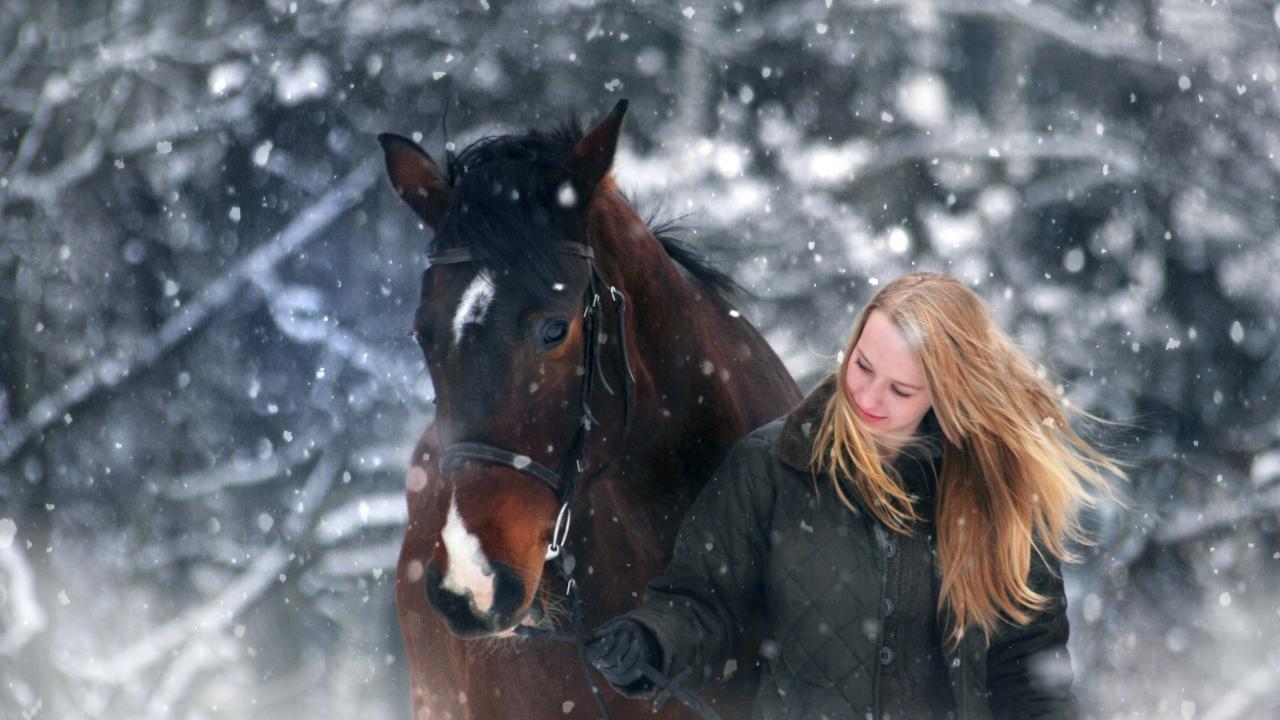 Wallpaper Beautiful young girl with a horse on a field covered with red poppies