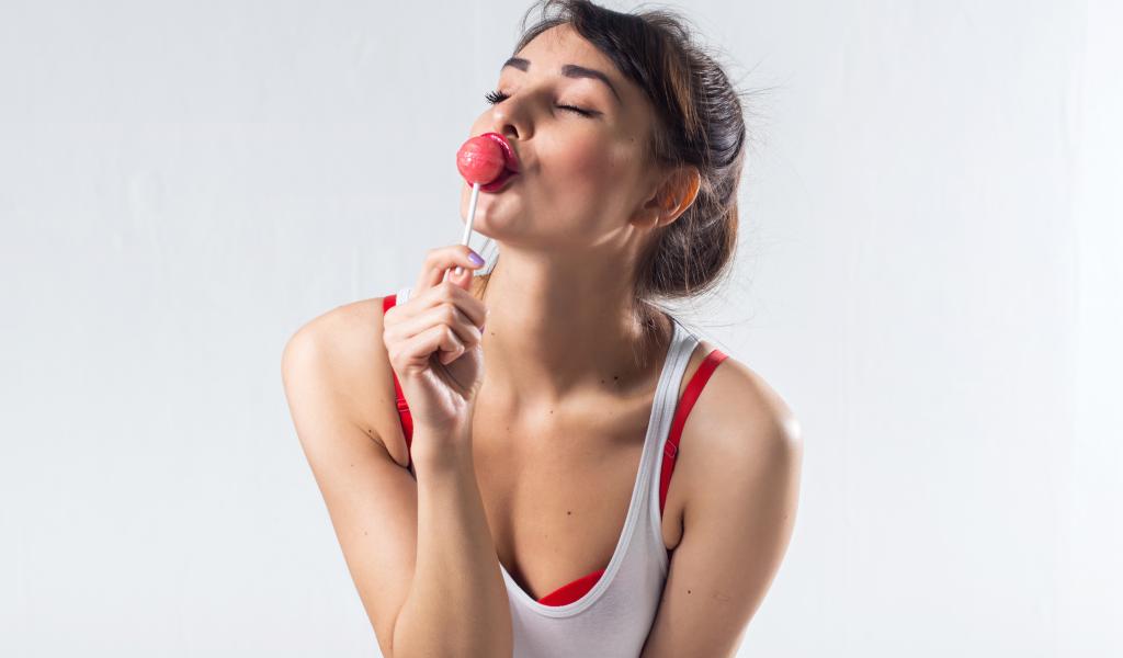 Wallpaper A young asian girl in a pink sweater with a big candy in her hands