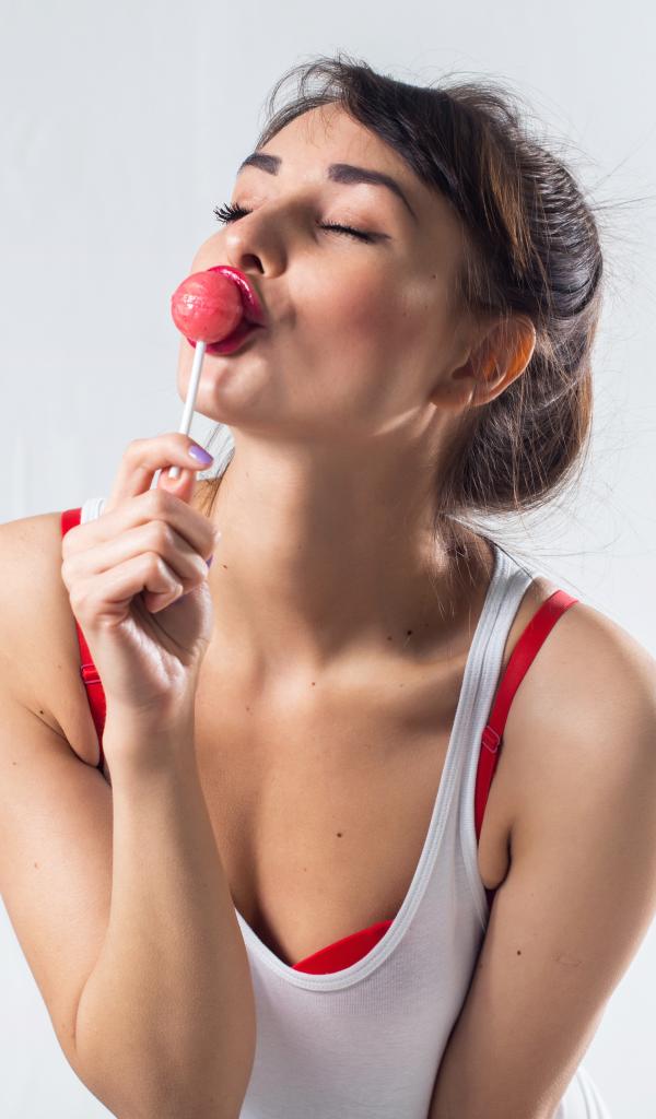 Wallpaper A young asian girl in a pink sweater with a big candy in her hands