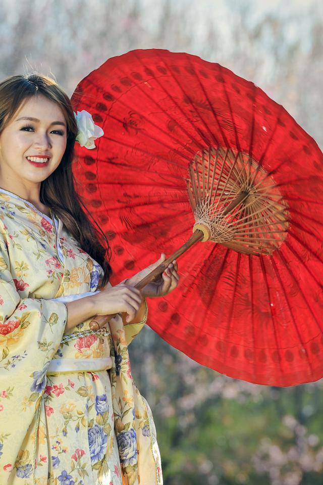 Wallpaper Asian girl in kimono with a red umbrella