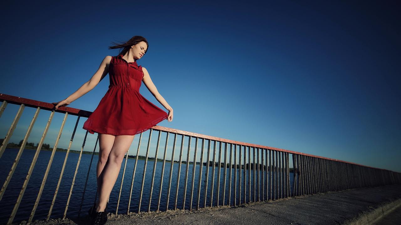 Wallpaper Girl in a short red dress on the bridge