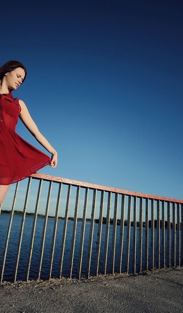 Wallpaper Girl in a short red dress on the bridge