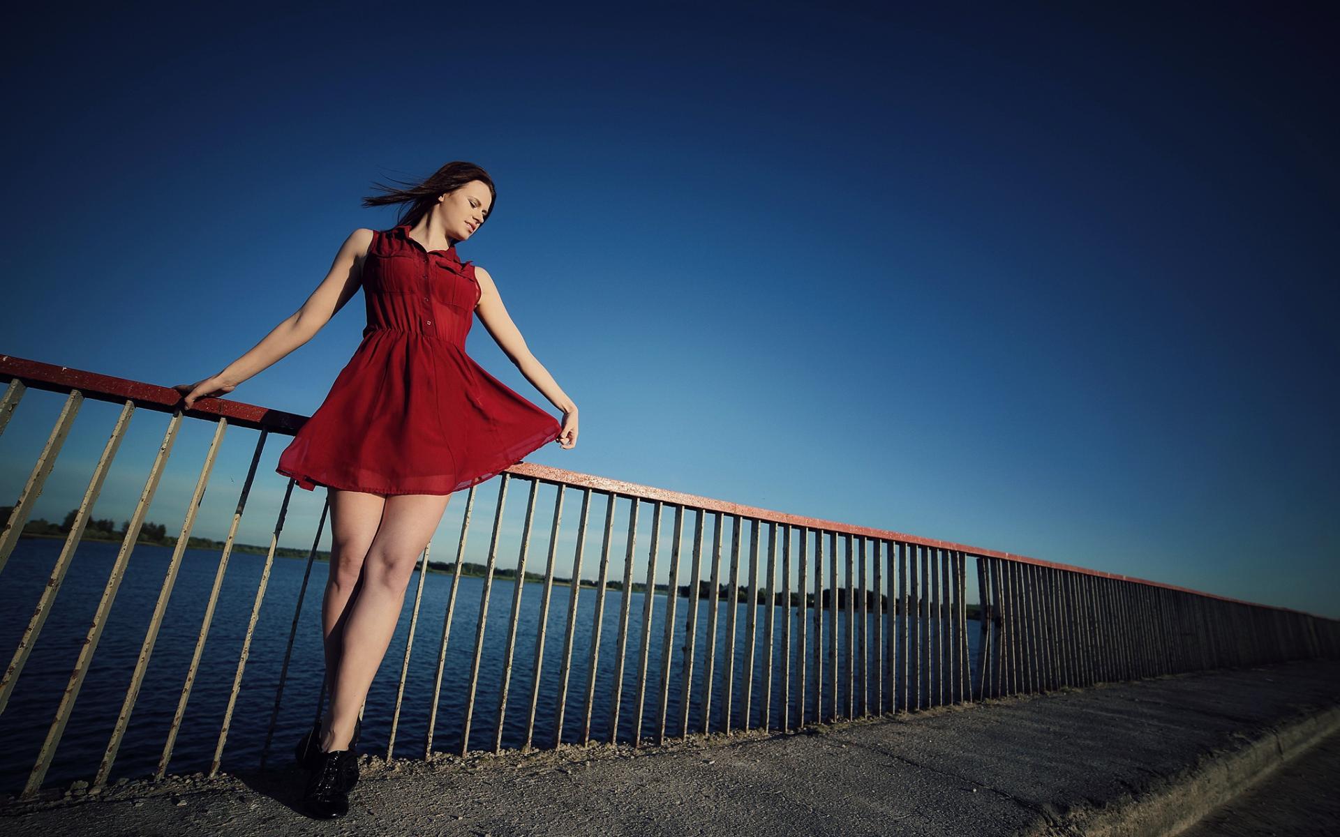 Wallpaper Girl in a short red dress on the bridge