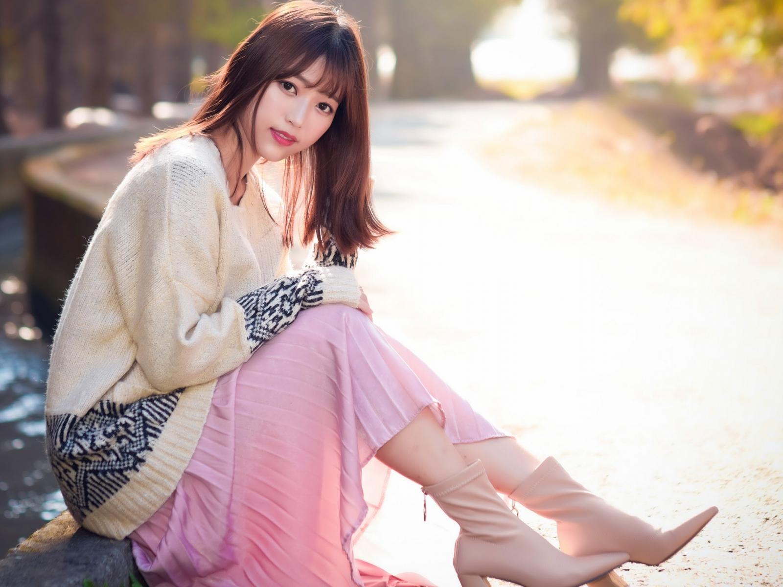 Wallpaper Asian girl sitting on the ground