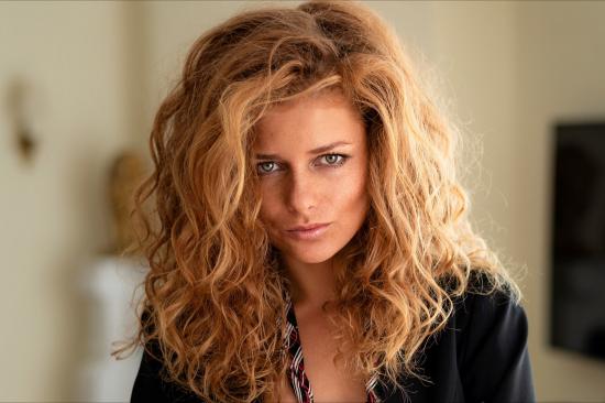 Wallpaper Red-haired woman with green eyes in a black jacket