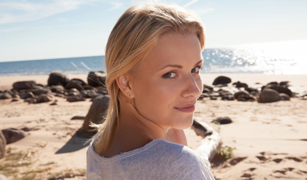 Wallpaper Beautiful smiling blonde on the beach near the ocean