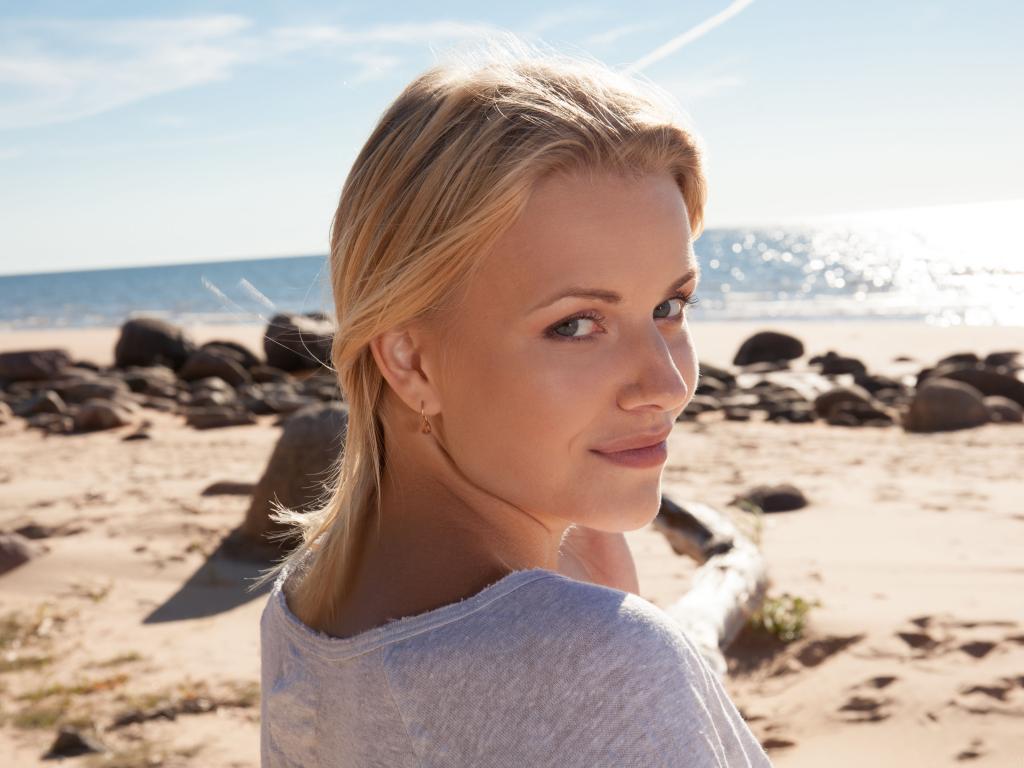 Wallpaper Beautiful smiling blonde on the beach near the ocean