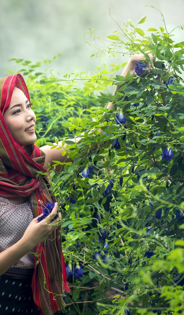 Wallpaper Asian girl collects flowers in the basket