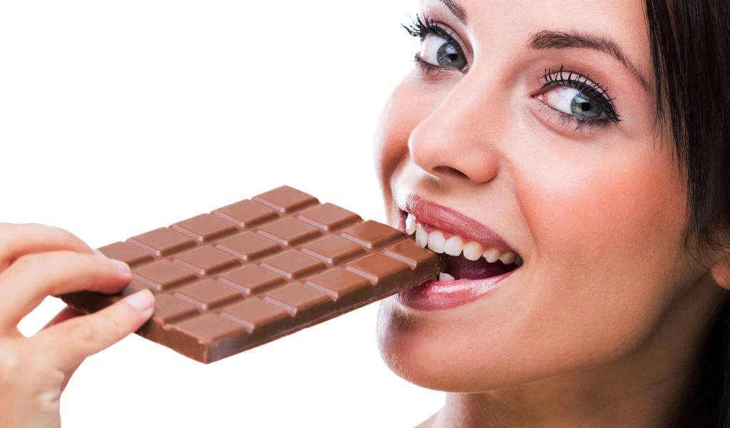Wallpaper Young girl bites milk chocolate on white background