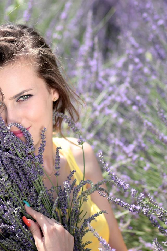 Wallpaper Beautiful blue-eyed girl with a bouquet of lavender