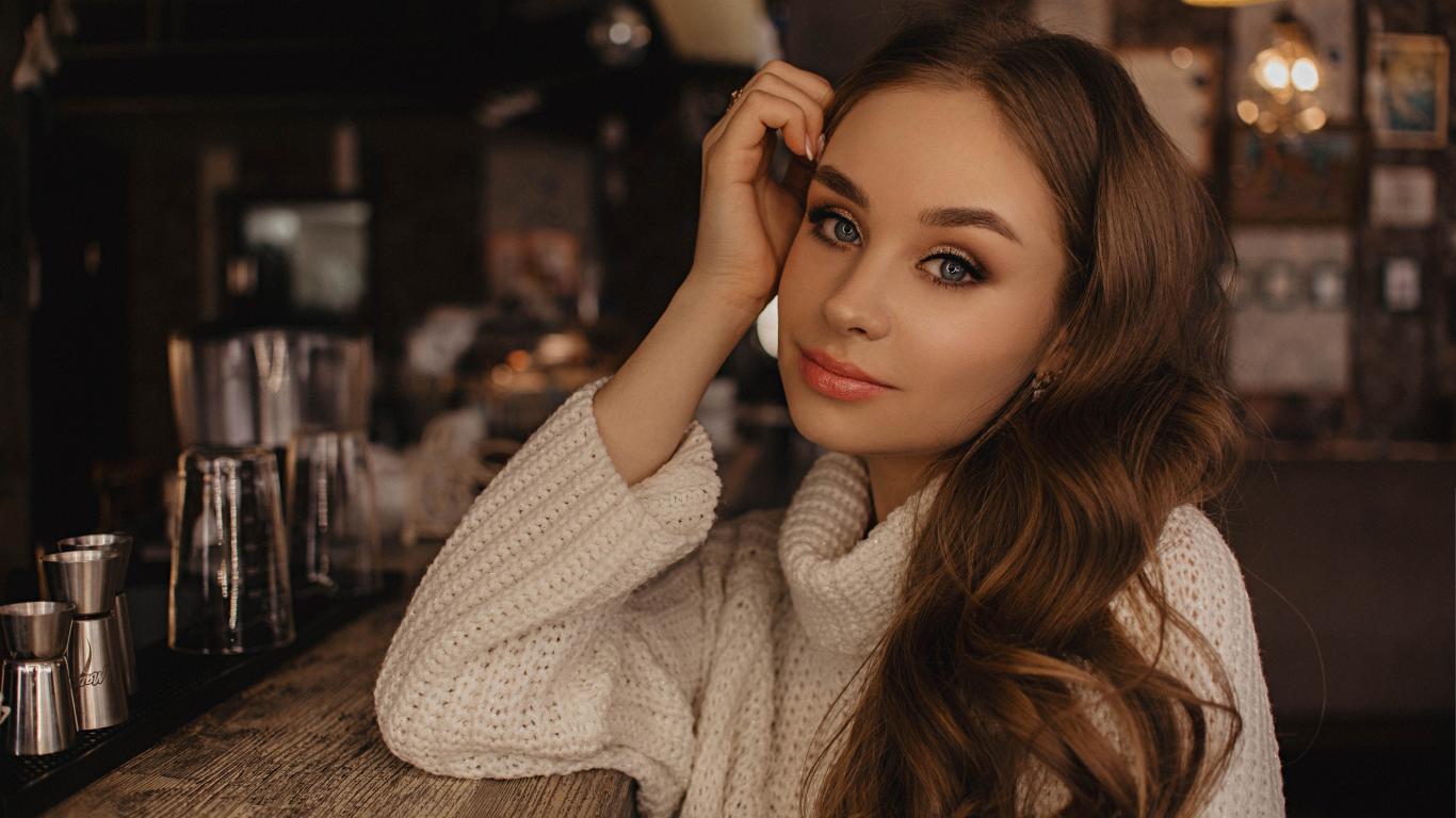Wallpaper Beautiful blue-eyed girl in a white sweater in a cafe