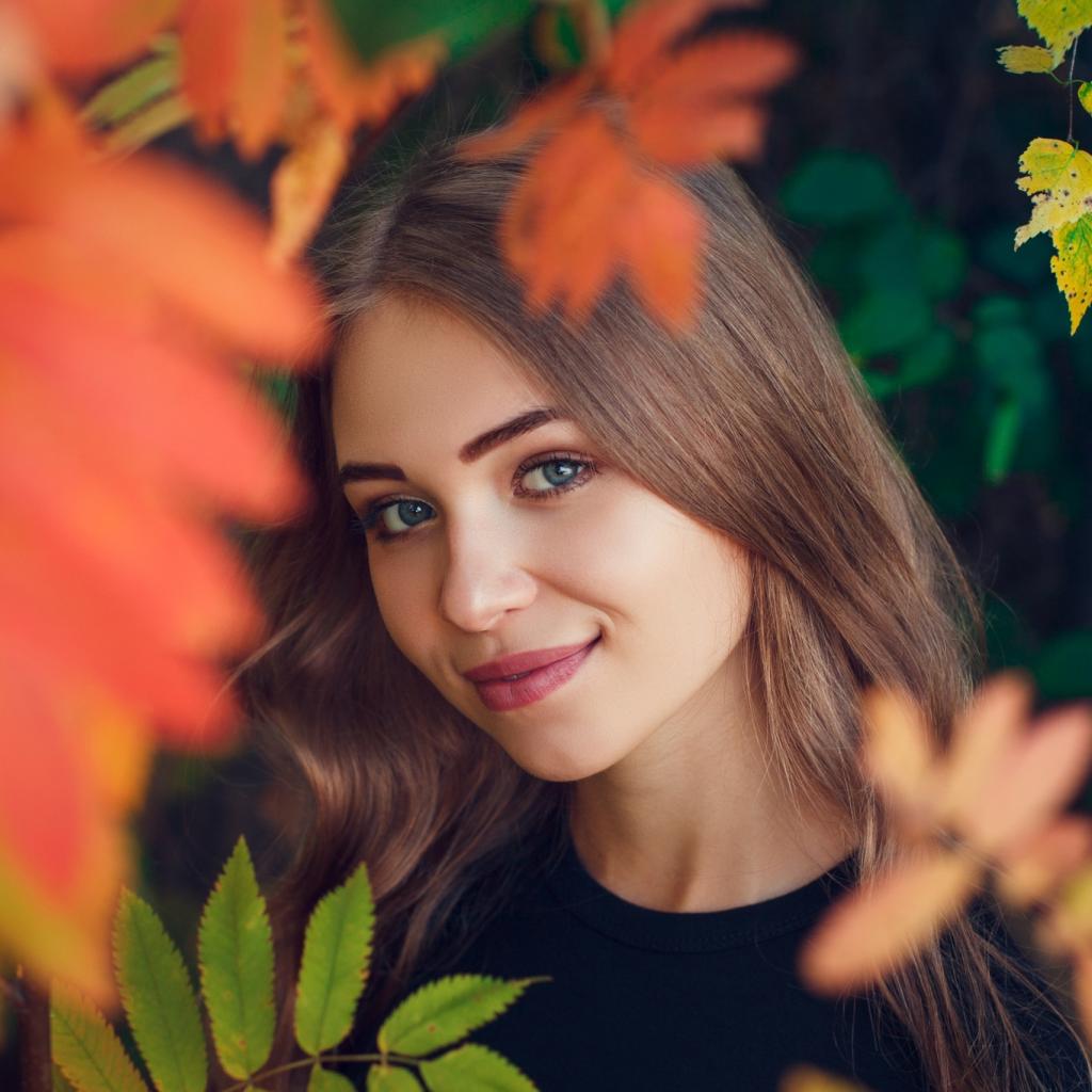 Wallpaper Beautiful blue-eyed brown-haired woman in the foliage