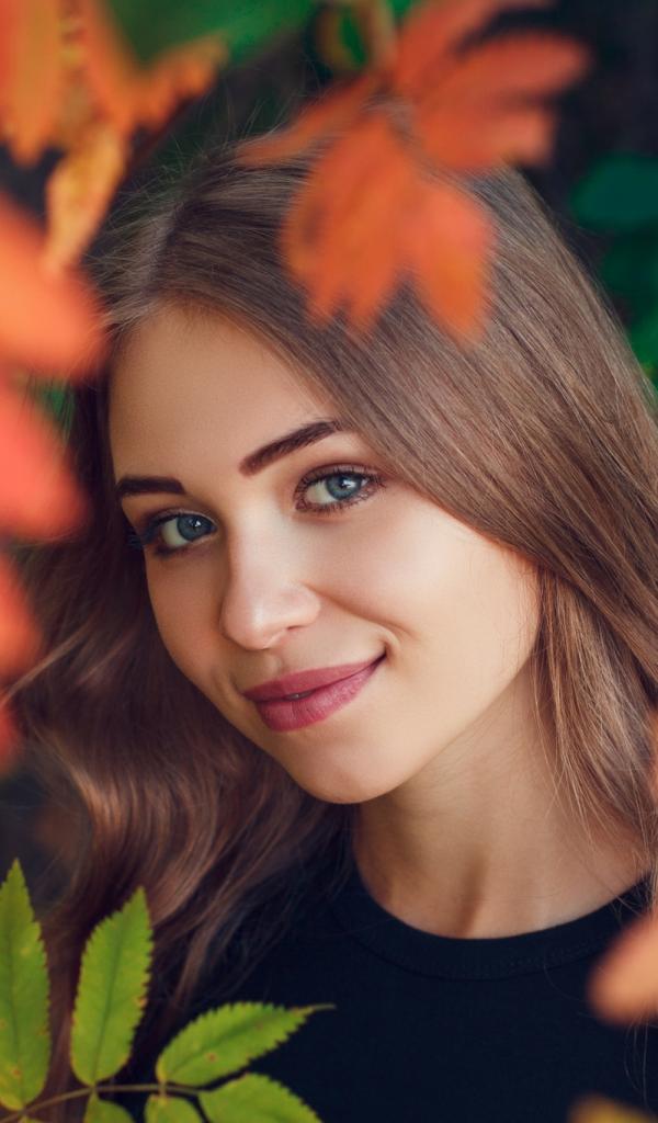 Wallpaper Beautiful blue-eyed brown-haired woman in the foliage