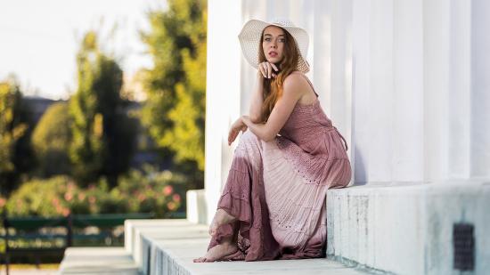 Wallpaper Beautiful girl in a white hat sitting on the steps